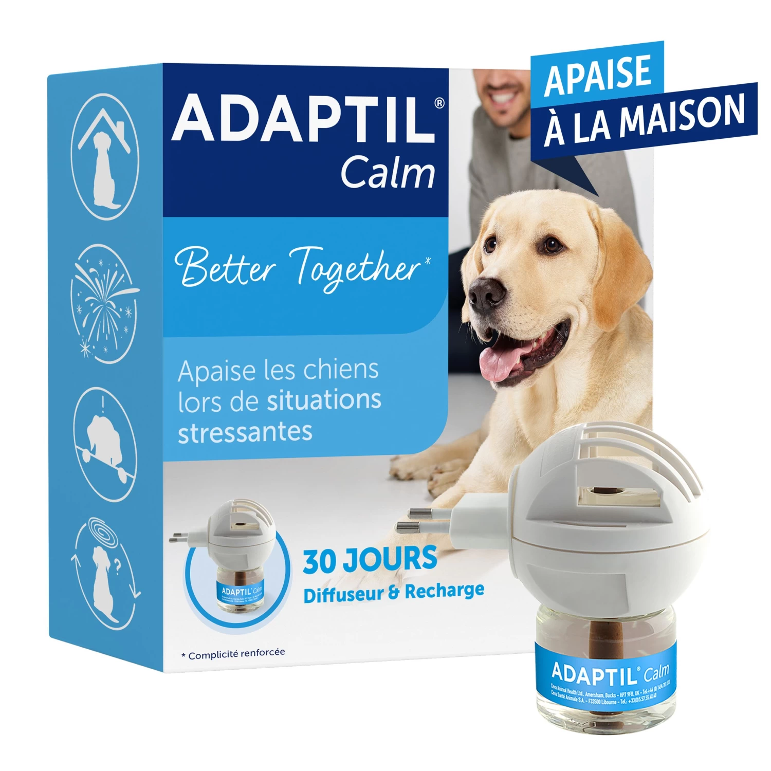 Anti-stress product voor honden op feromonenbasis. (DAP-Moederferomoon). ADAPTIL CALM helpt honden op natuurlijke wijze om te gaan met stresssituaties. Verdamper inpluggen in het stopcontact, bijgeleverde navulling werkt 1 maand. Navulling desgewenst maandelijks vervangen. De verdamper elke 6 maand vervangen.