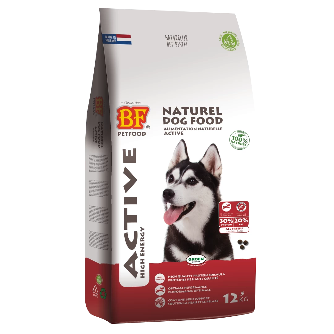BF Petfood® High Energy. Nederlandse topkwaliteit. Hoogwaardige premium en natuurlijke grondstoffen. Volledige licht verteerbare geëxtrudeerde hondenvoeding voor volwassen honden. Met veel kip en tarwevrij recept. Hoge acceptatie en verteerbaarheid. Eiwit/vet (30/20). Ook zeer geschikt voor honden met overgewicht (weinig koolhydraten), kleinere hondenrassen, jacht-, training en sporthonden, jonge honden van grote hondenrassen en voor de dracht- en zoogperiode en het in conditie komen na ziekte. Optimale voeding die zorgt voor een betere vertering, ontlasting en een goede conditie van uw hond. Zonder chemische toevoegingen. Voor alle hondenrassen.