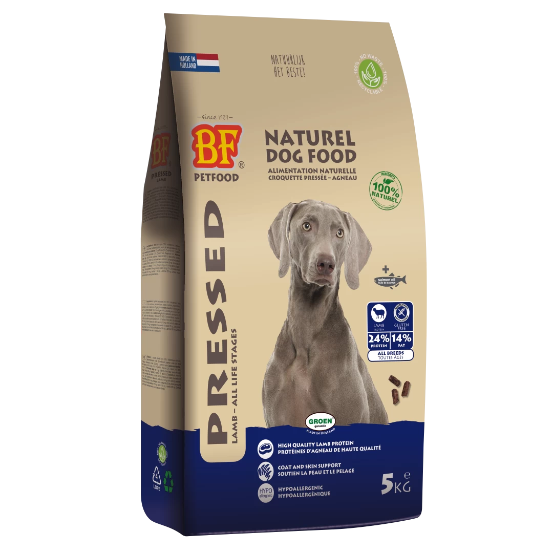 BF Petfood® Geperst Lam. Nederlandse topkwaliteit. Met hoogwaardige premium en natuurlijke grondstoffen. Volledige zeer goed verteerbare koud geperste all life stage hondenvoeding. Rijk aan lam. Hypoallergeen (1 dierlijke eiwitbron: lam) en tarwe- en glutenvrij. Hoge acceptatie en verteerbaarheid. Voor voedingsgevoelige en/of kieskeurige honden en moeilijke eters. Ook geschikt voor drachtige en actieve honden. Lage maagbelasting en verhitting van de brok. Zonder chemische toevoegingen. Optimale voeding die zorgt voor een betere vertering, ontlasting en een goede conditie van uw hond. Voor alle hondenrassen.