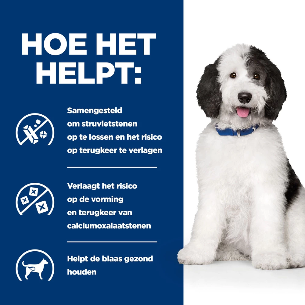 Hill’s PRESCRIPTION DIET c/d Multicare Stew (Stoofpotje) voor honden met Kip en toegevoegde groenten is een volledig dieetvoer voor het verminderen van het terugkeren van struvietstenen, het oplossen van struvietstenen en het verminderen van de vorming van oxalaatstenen bij volwassen honden. Dit voer heeft urine-onderverzadigende eigenschappen voor struviet, urine-alkaliserende eigenschappen en een laag magnesium-, calcium- en vitamine D-gehalte.