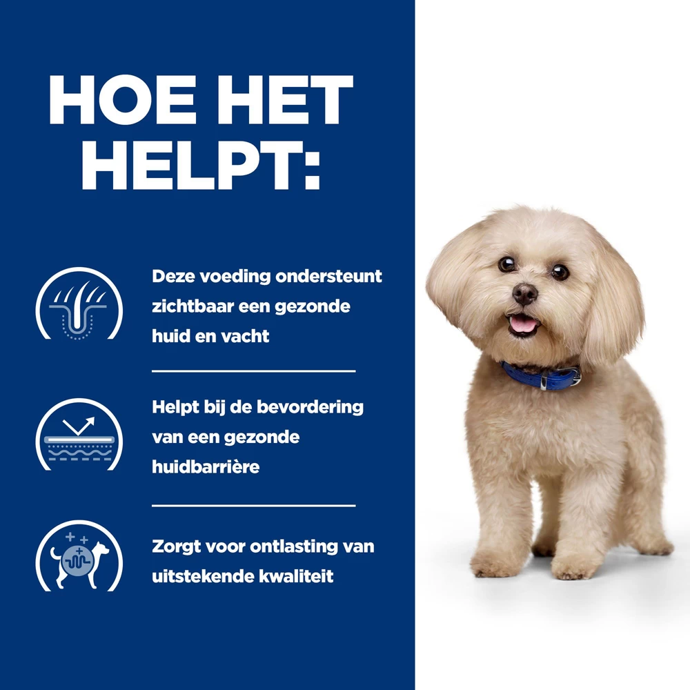 Voedselovergevoeligheden ontstaan doordat eiwitten de huid binnendringen en via het spijsverteringsstelsel door het lichaam gaan, waardoor het immuunsysteem reageert. z/d Mini is een gespecialiseerd voer met eiwitten die zacht zijn en in kleinere stukjes gebroken zijn om detectie door het immuunsysteem te helpen voorkomen. Het voer helpt je hond beter te eten en bevat prebiotica om een gezond evenwicht in het darmmicrobioom te creëren en vetzuren om een gezonde huid op te bouwen.