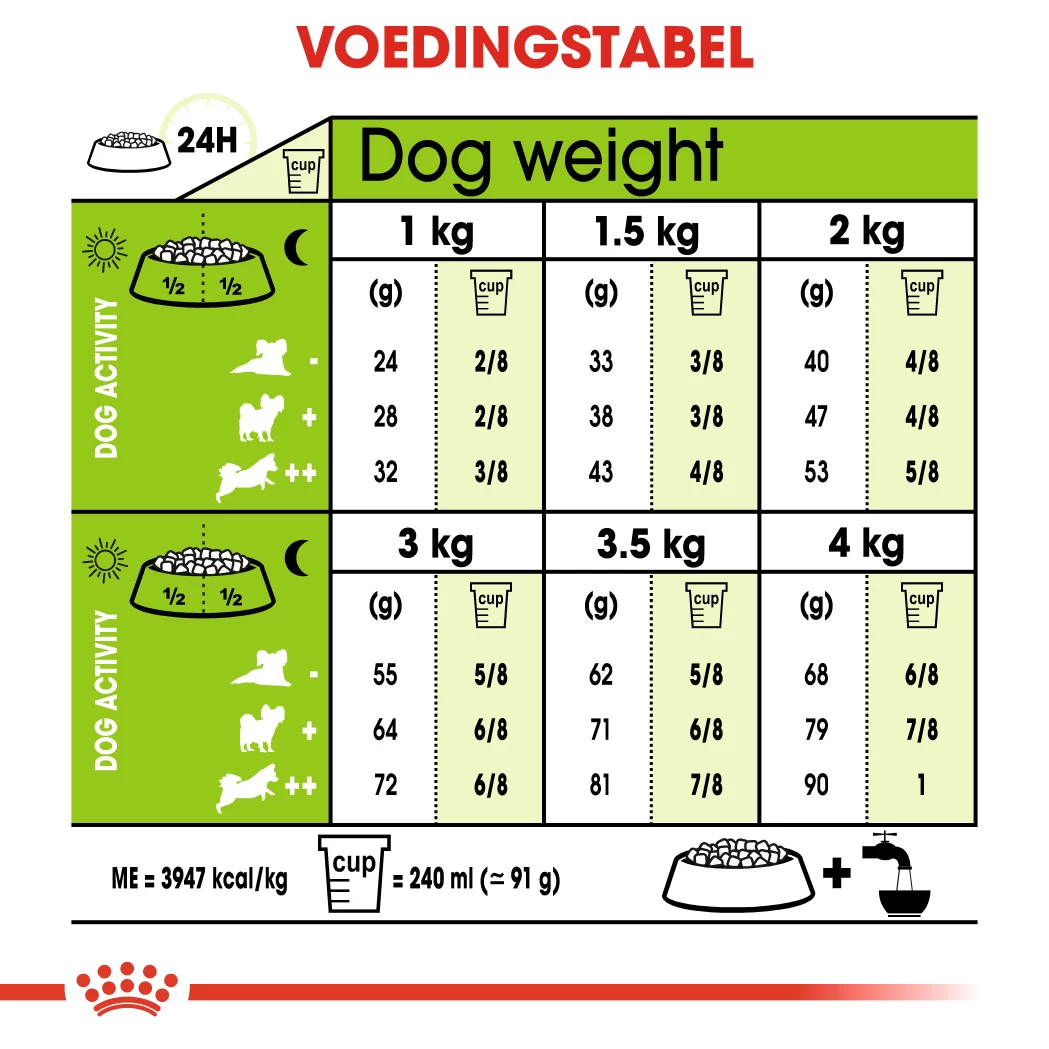 ROYAL CANIN® X-Small Ageing 12+ is geschikt voor zeer kleine honden ouder dan 12 jaar, met een lichaamsgewicht tot 4 kilogram, en is speciaal samengesteld met de voedingsbehoeften van jouw kleine volwassen hond in het achterhoofd.