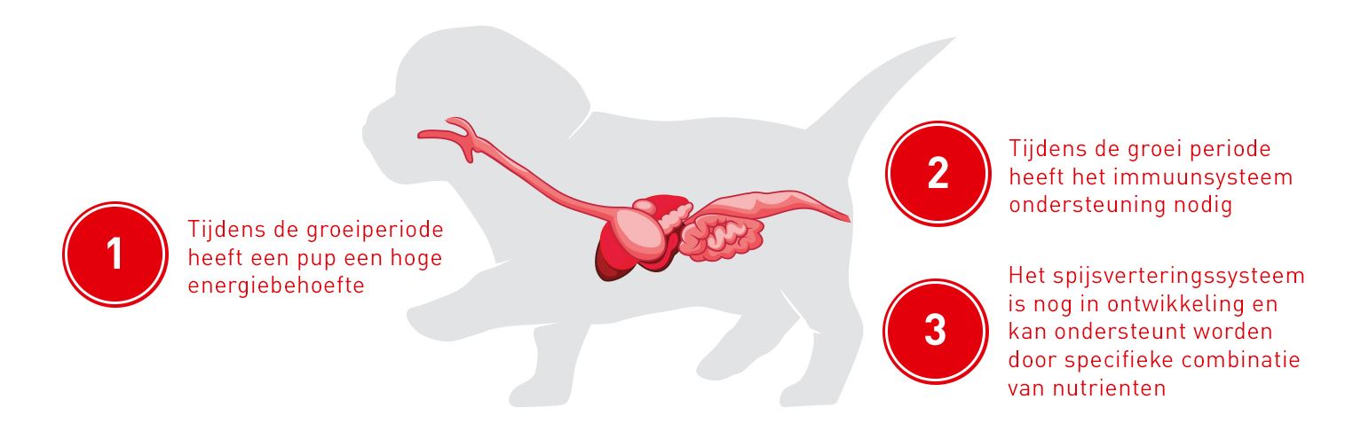 Een pup is een opgroeiende hond: de samenstelling, structuur en grootte van de voeding moet aangepast worden aan de leeftijd van je pup. De juiste voeding tijdens de groeiperiode speelt belangrijke rol in de verdere ontwikkeling en gezondheid van je pup.Â